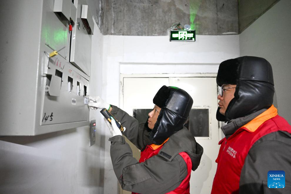 Staff members of Hulun Buir Power Supply Company of State Grid East Inner Mongolia Electric Power Co., Ltd check power supply devices at a residential compound in Hulun Buir, north China's Inner Mongolia Autonomous Region, Dec. 16, 2023. Countermeasures have been taken to prevent or alleviate impacts inflicted by extensive snowfall and other freezing conditions. (Xinhua/Bei He)
