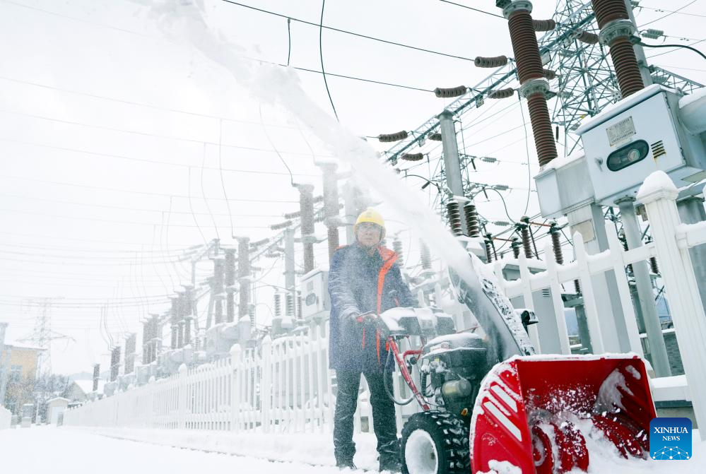 An employee of power supply company clears snow in Benxi, northeast China's Liaoning Province, Dec. 15, 2023. Countermeasures have been taken to prevent or alleviate impacts inflicted by extensive snowfall and other freezing conditions. (Xinhua)