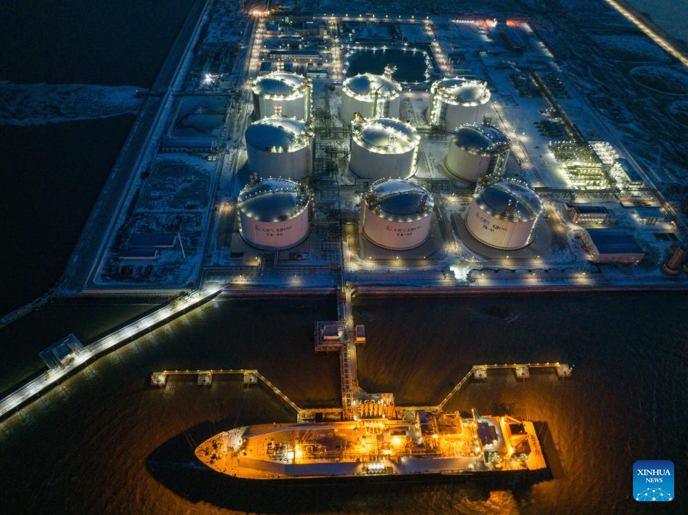 This aerial photo shows an LNG ship unloading at the Tianjin LNG Terminal (Sinopec) in north China's Tianjin, Dec. 16, 2023. Countermeasures have been taken to prevent or alleviate impacts inflicted by extensive snowfall and other freezing conditions. (Photo by Wang Jun/Xinhua)