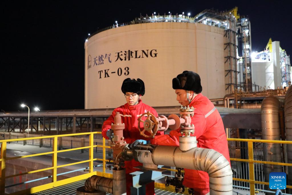 Staff members inspect pipelines at Tianjin LNG Terminal (Sinopec) in north China's Tianjin, Dec. 16, 2023. Countermeasures have been taken to prevent or alleviate impacts inflicted by extensive snowfall and other freezing conditions. (Photo by Wang Jun/Xinhua)