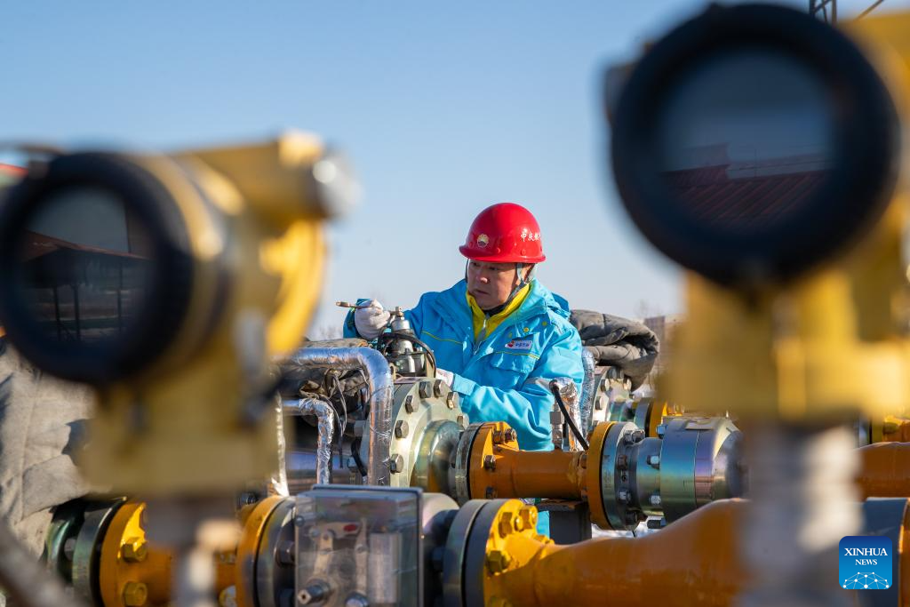 A staff member of Harbin Zhongqing Gas inspects pipelines in Harbin, northeast China's Heilongjiang Province, Dec. 17, 2023. Countermeasures have been taken to prevent or alleviate impacts inflicted by extensive snowfall and other freezing conditions. (Xinhua/Zhang Tao)