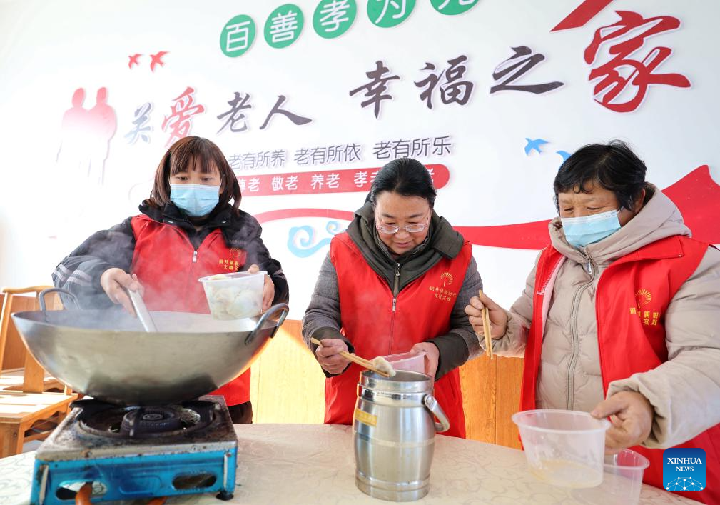 Volunteers make dumplings for solitary and troubled elders at the Dushan Community in Linyi, east China's Shandong Province, Dec. 17, 2023. Countermeasures have been taken to prevent or alleviate impacts inflicted by extensive snowfall and other freezing conditions. (Photo by Wang Yanbing/Xinhua)