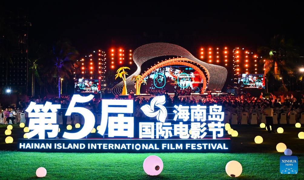 This photo taken on Dec. 16, 2023 shows the opening ceremony of the 5th Hainan Island International Film Festival in Sanya, south China's Hainan Province. The festival runs from Dec. 16 to 22. (Xinhua/Fan Yuqing)