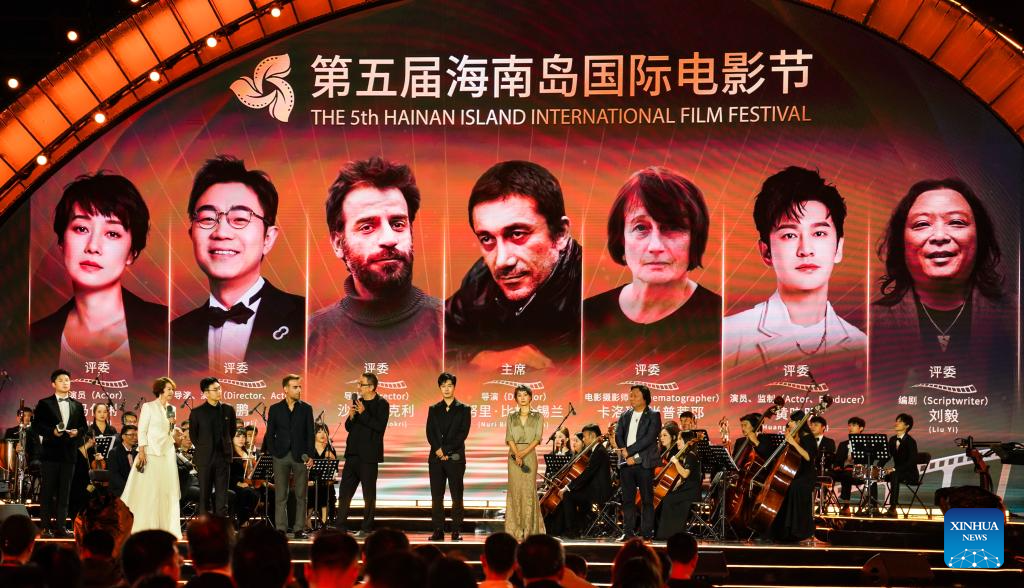 Jury members of Golden Coconut Awards are pictured during the opening ceremony of the 5th Hainan Island International Film Festival in Sanya, south China's Hainan Province, Dec. 16, 2023. The festival runs from Dec. 16 to 22. (Xinhua/Fan Yuqing)