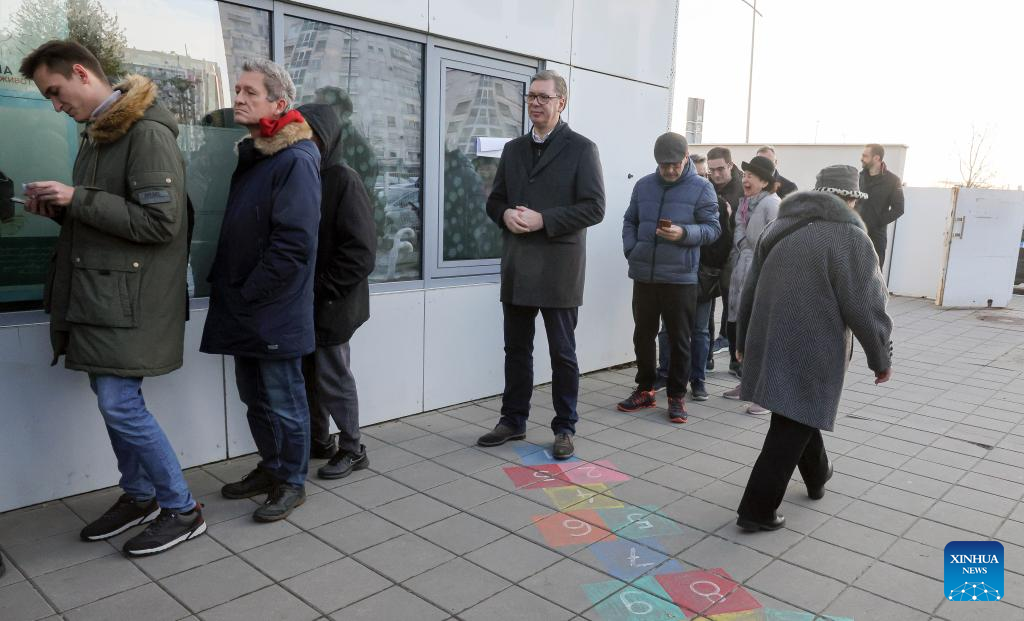 Serbian President Aleksandar Vucic (C) waits in a queue outside a polling station in Belgrade, Serbia, on Dec. 17, 2023. (Photo by Predrag Milosavljevic/Xinhua)