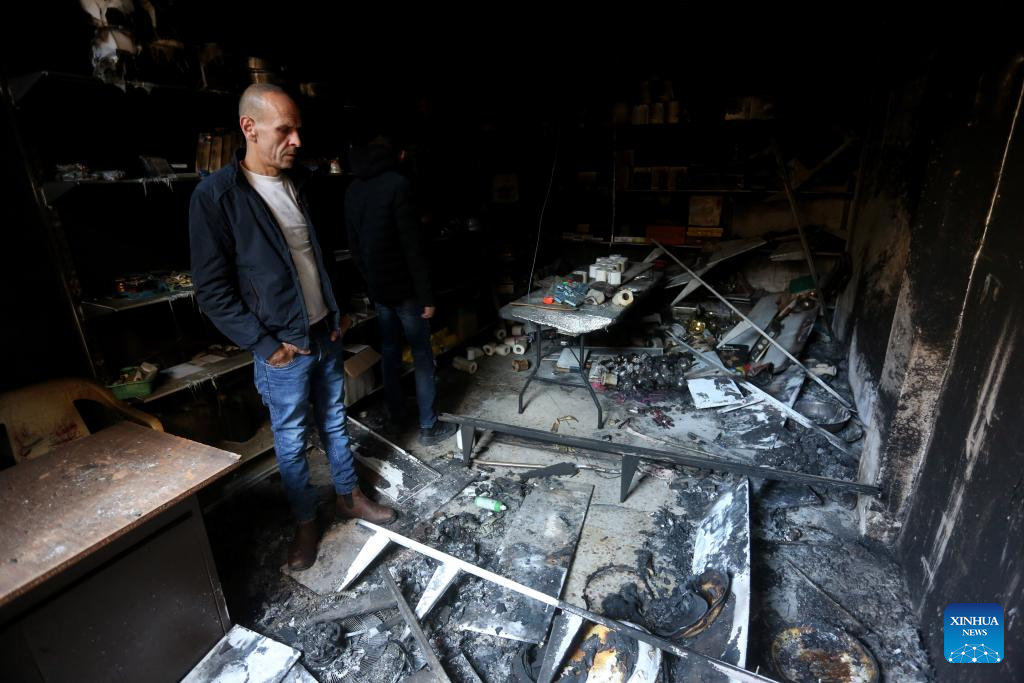 A Palestinian inspects a damaged building at a refugee camp near the northern West Bank city of Tulkarm after Israeli raids on Dec. 17, 2023. (Photo by Nidal Eshtayeh/Xinhua)