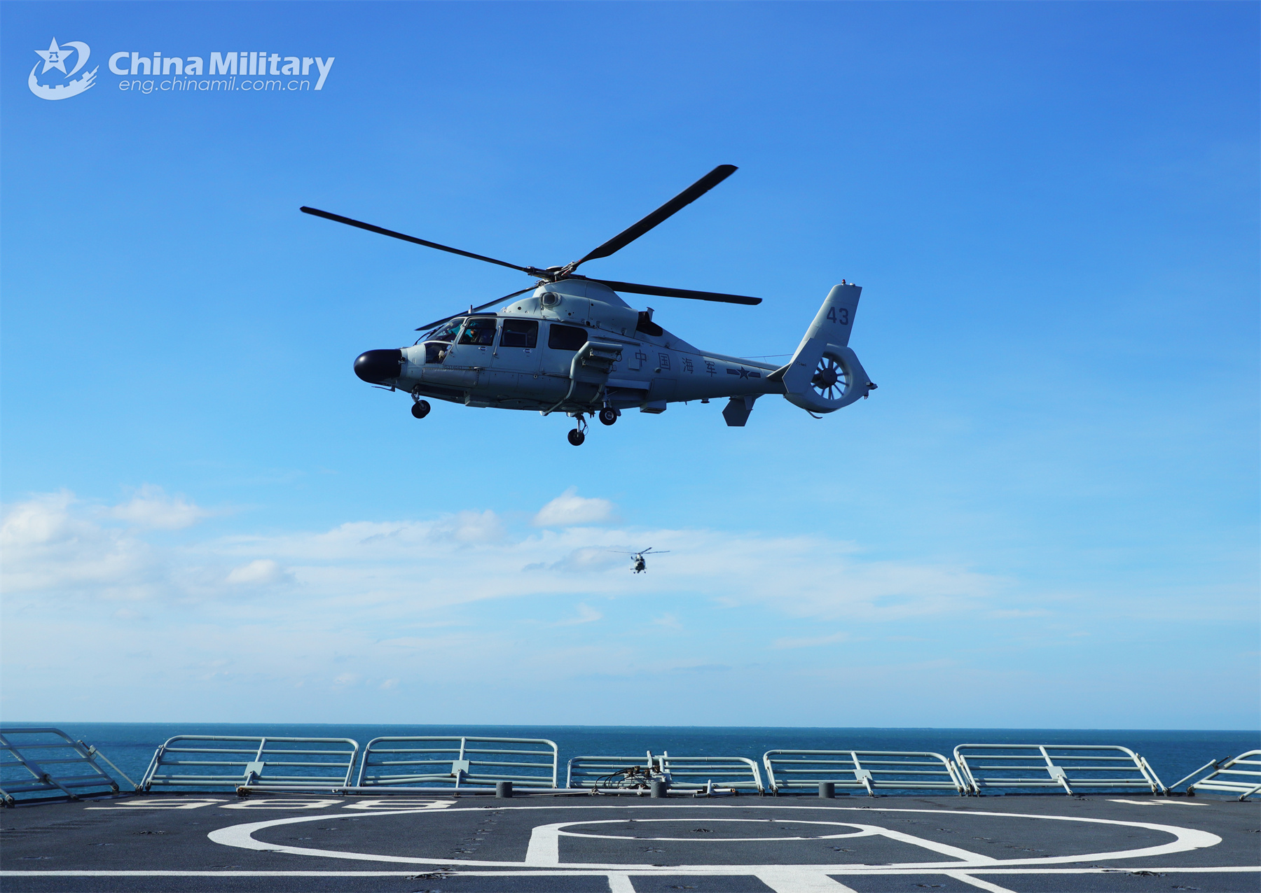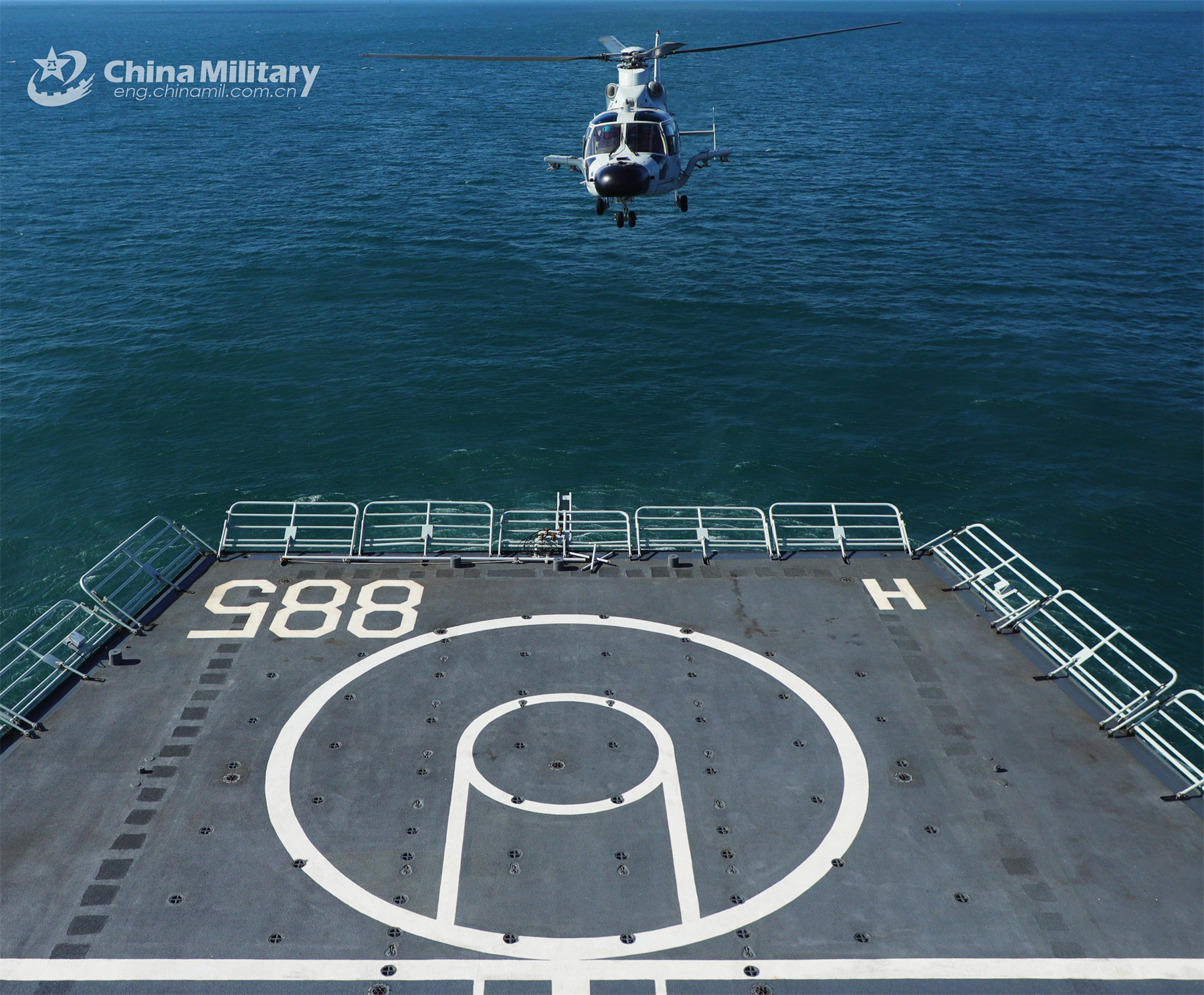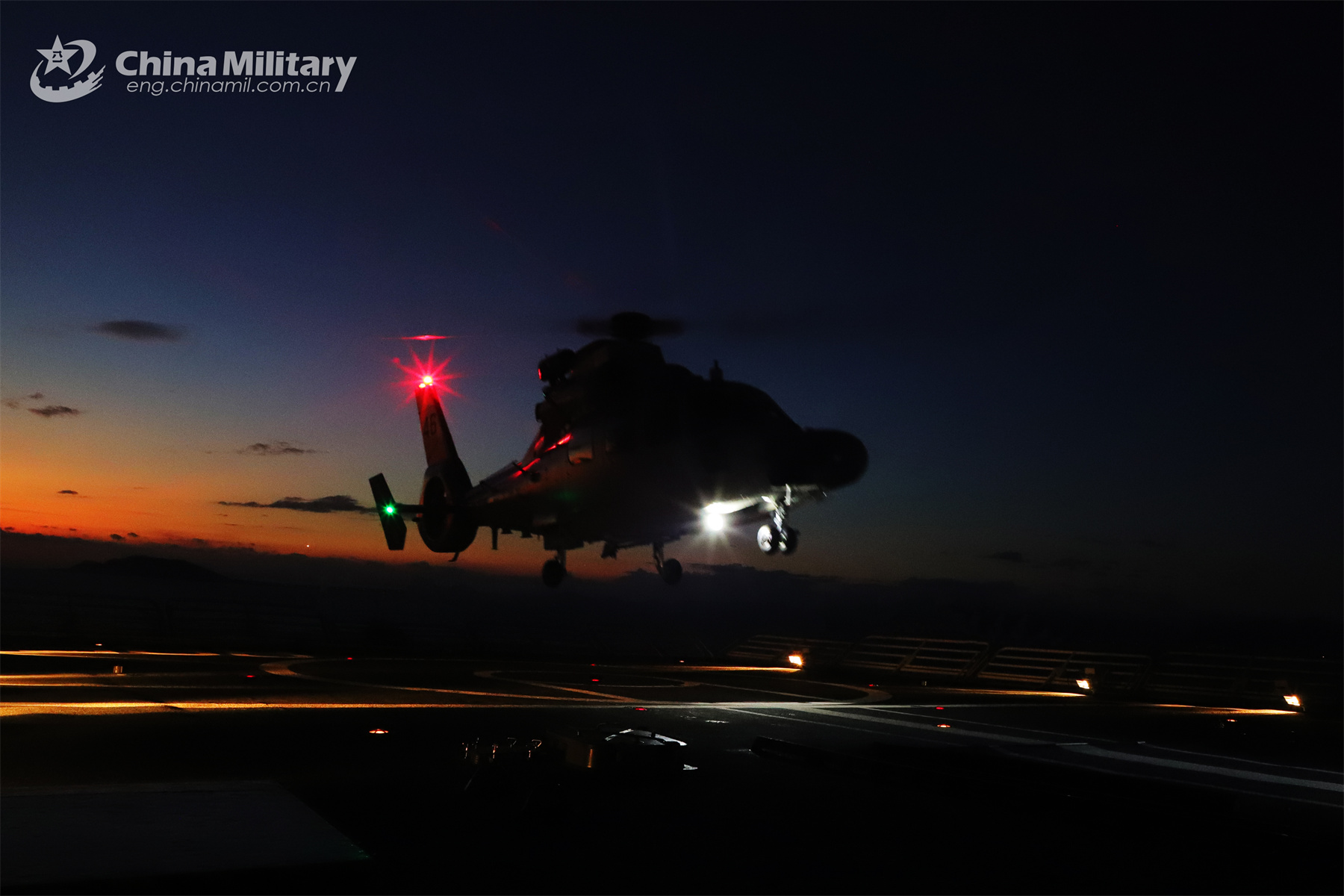 A ship-borne helicopter attached to a combat support ship flotilla of the navy under the PLA Southern Theater Command conducts takeoff and landing training in late November, 2023. (eng.chinamil.com.cn/Photo by Peng Jun)