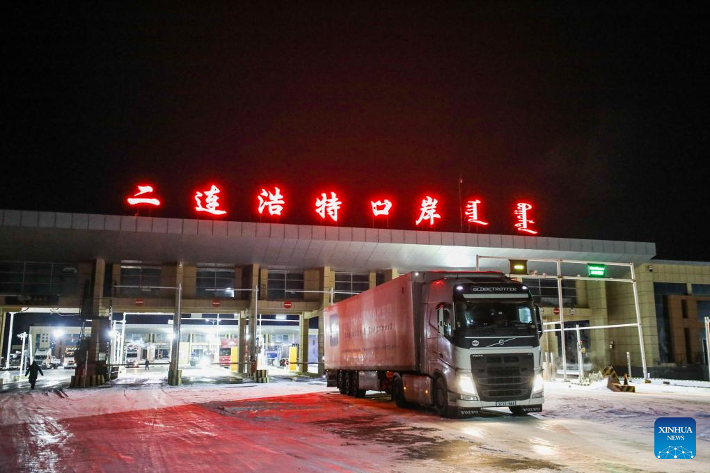 A cargo vehicle passes the highway port of Erenhot in north China's Inner Mongolia Autonomous Region, Dec. 16, 2023. (Photo by Guo Pengjie/Xinhua)