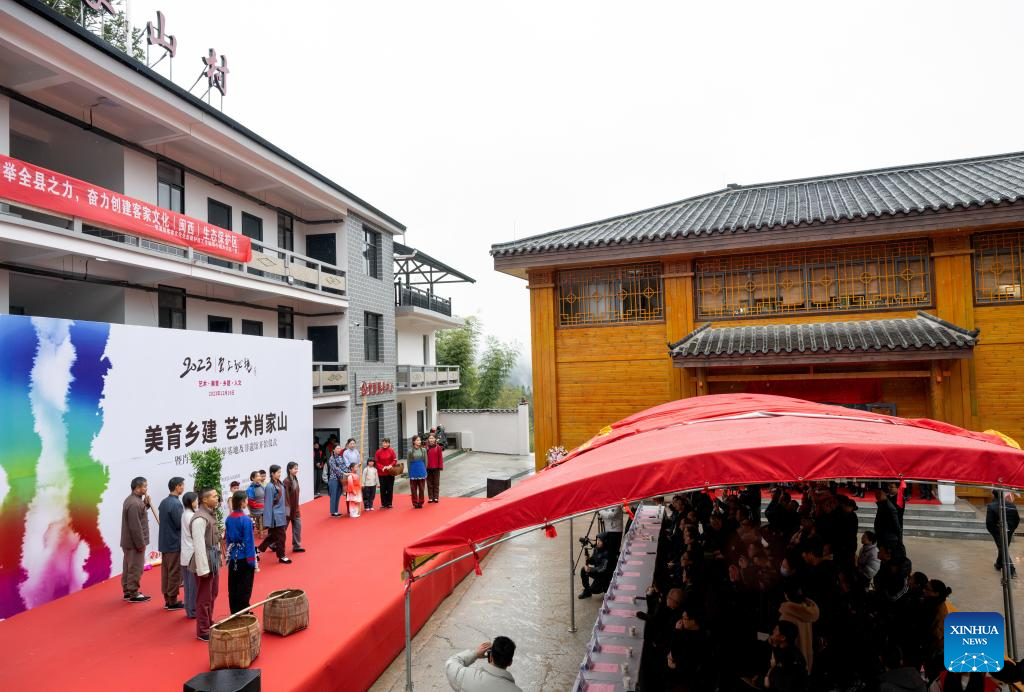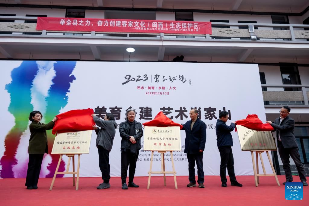 A performance is staged during the opening ceremony of Xiaojiashan aesthetic education research base and an intangible cultural heritage museum in Xiaojiashan Village of Sanming City, southeast China's Fujian Province, Dec. 16, 2023. To utilize its land resources, Xiaojiashan Village has introduced quality academic resources to build an aesthetic education research base. The base will be equipped with an operation team in the future to better fulfill its functions. (Xinhua/Wei Peiquan)