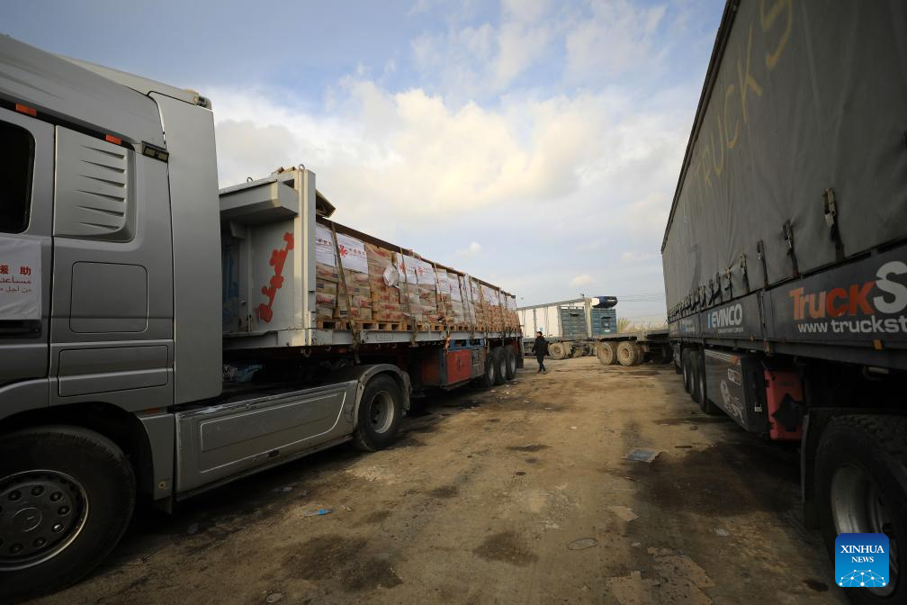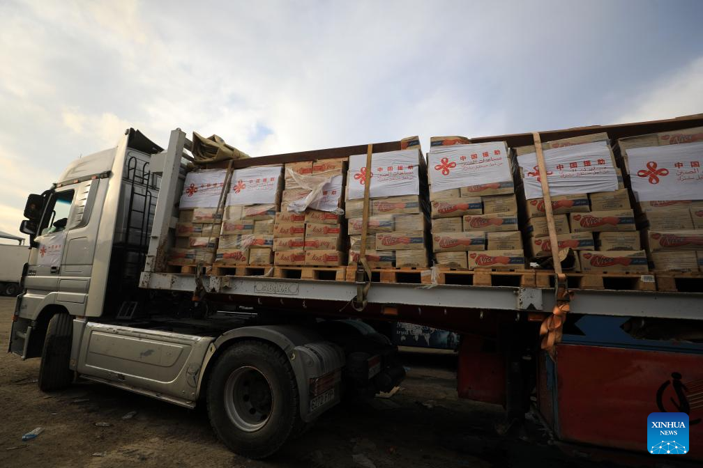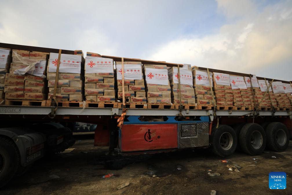 A truck loaded with humanitarian aid supplies provided by China is seen on the Gaza side of the Kerem Shalom border crossing between Israel and the Gaza Strip, Dec. 17, 2023. (Photo by Yasser Qudih/Xinhua)