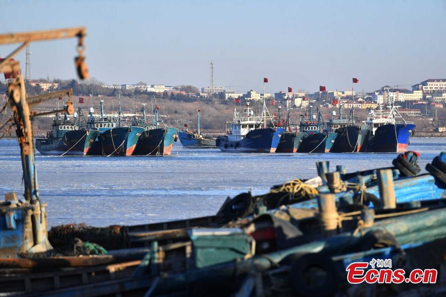 Fishing boats with icicles berth at the frozen Jiaozhou Bay, forming an "ice age" scene in Qingdao, east China's Shandong Province, Dec. 17, 2023. (Photo: China News Service/Wang Haibin)