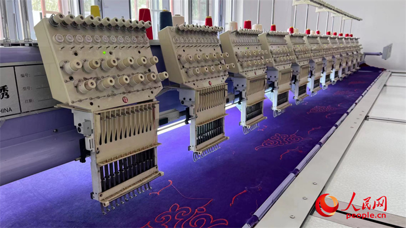 Photo shows automatic multi-head computerized embroidery machines at Tukong Share's embroidery base. (People's Daily Online/Li Haoyang)