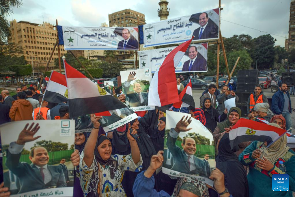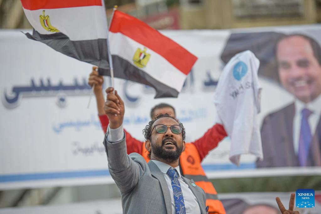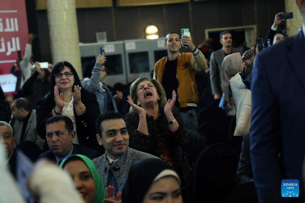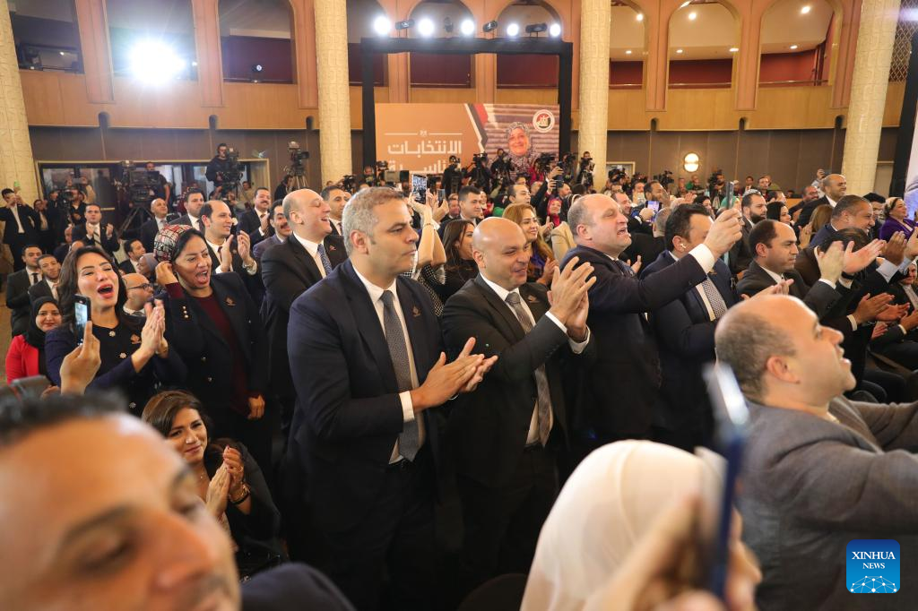 Supporters celebrate after incumbent Egyptian President Abdel-Fattah al-Sisi won the 2024 presidential election, in Cairo, Egypt, on Dec. 18, 2023. Egypt's National Election Authority (NEA) declared on Monday that incumbent President Abdel-Fattah al-Sisi won the 2024 presidential election with some 40 million, or 89.6 percent of valid votes. (Photo by Mohamed Asad/Xinhua)