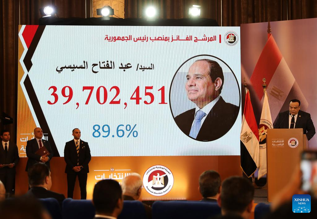 CAIRO, Dec. 18 (Xinhua) -- Egypt's National Election Authority (NEA) declared on Monday that incumbent President Abdel-Fattah al-Sisi won the 2024 presidential election with some 40 million, or 89.6 percent of valid votes.
