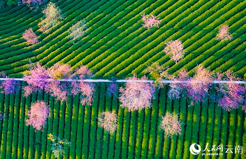 The Cherry Valley on Wuliang Mountain in Dali, southwest China's Yunnan Province, is a breathtaking sight with its vast tea fields and tens of thousands of cherry blossom trees. (Photo/Yang Guangyu)