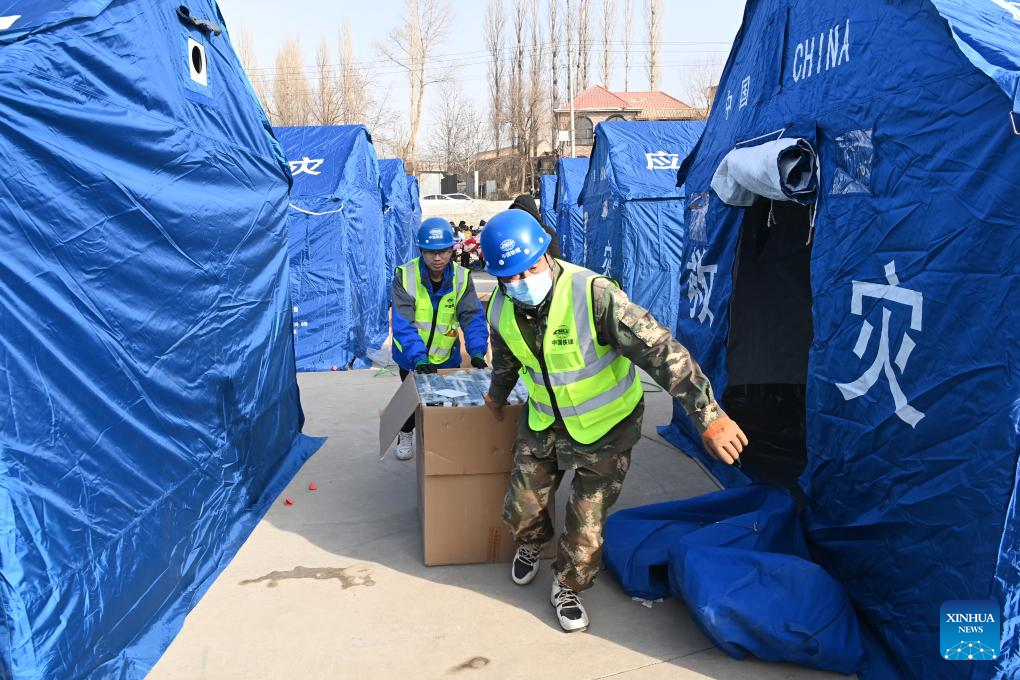 Rescuers carry disaster relief materials at a temporary shelter in Dahe Village of Bonan-Dongxiang-Salar Autonomous County of Jishishan, northwest China's Gansu Province, Dec. 19, 2023. (Xinhua/Fan Peishen)