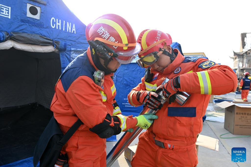 Rescuers install a stove at a temporary shelter in Dahe Village of Bonan-Dongxiang-Salar Autonomous County of Jishishan, northwest China's Gansu Province, Dec. 19, 2023. (Xinhua/Fan Peishen)