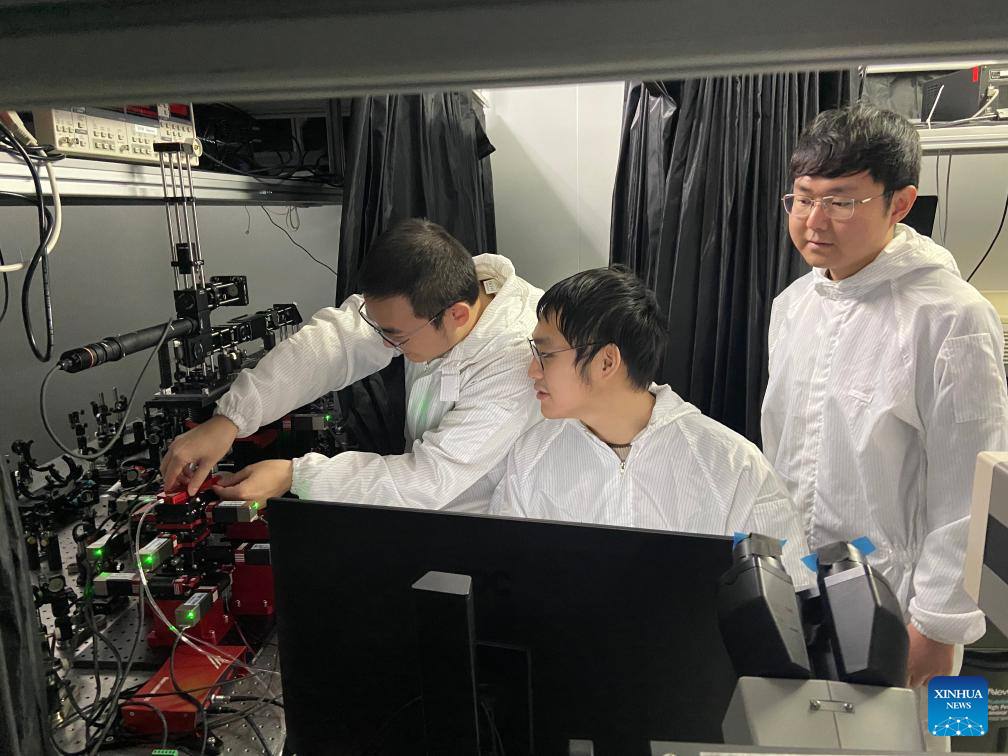 Researchers use equipment to prepare optical crystal and test wavelength conversion at a lab in Peking University, Beijing, capital of China, Dec. 15, 2023. A team of Chinese researchers used a novel theory to invent a new type of ultrathin optical crystal with high energy efficiency, laying the foundation for next-generation laser technology. (Xinhua/Wei Mengjia)