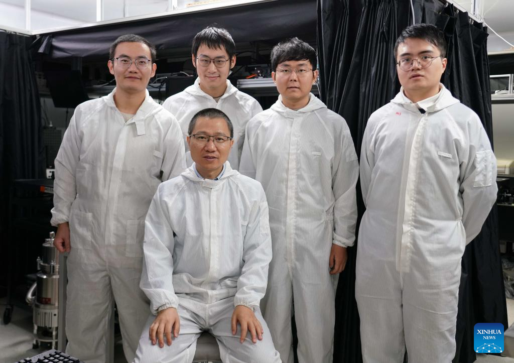 Liu Kaihui (front), director of the Institute of Condensed Matter and Material Physics, School of Physics, Peking University, and other members of a research team pose for a group photo in Peking University, Beijing, capital of China, Dec. 15, 2023. A team of Chinese researchers used a novel theory to invent a new type of ultrathin optical crystal with high energy efficiency, laying the foundation for next-generation laser technology. (Xinhua/Wei Mengjia)