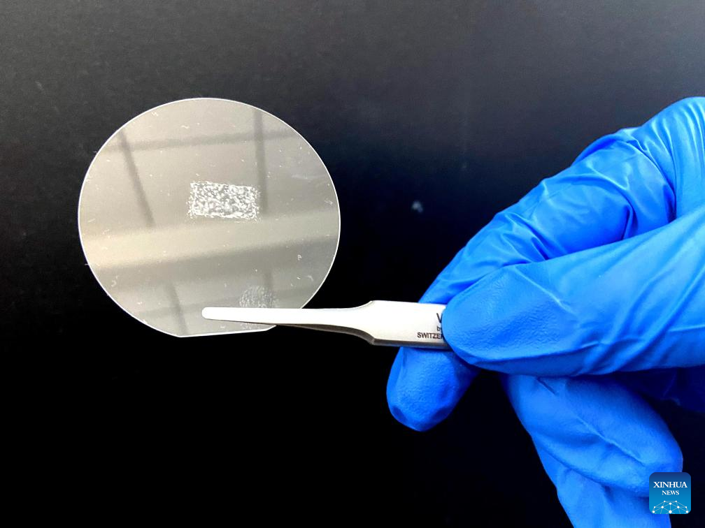 This photo taken on Dec. 15, 2023 shows a Twist Boron Nitride (TBN) crystal placed on a piece of fused silica in Peking University, Beijing, capital of China. A team of Chinese researchers used a novel theory to invent a new type of ultrathin optical crystal with high energy efficiency, laying the foundation for next-generation laser technology. (Xinhua/Wei Mengjia)