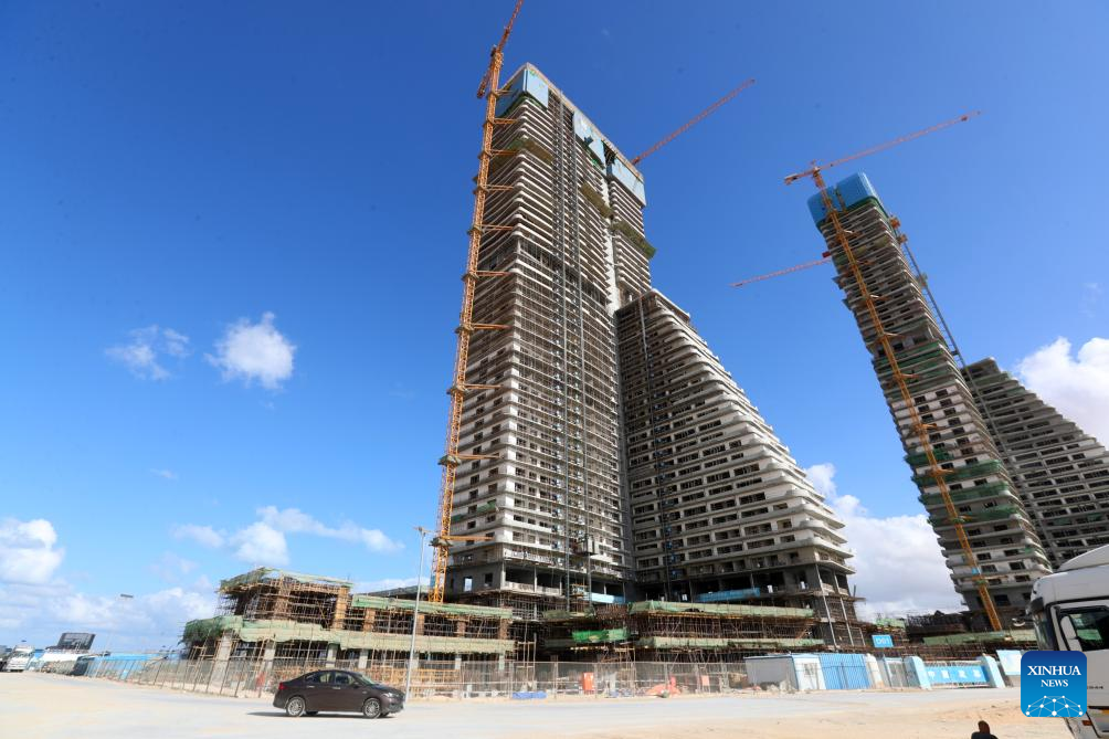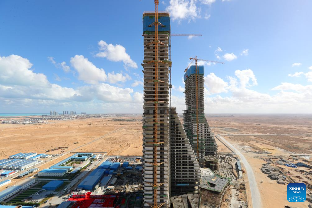 This photo taken on Dec. 18, 2023 shows the construction site of the Alamein Downtown Towers Project in New Alamein City, Egypt. (Xinhua/Sui Xiankai)