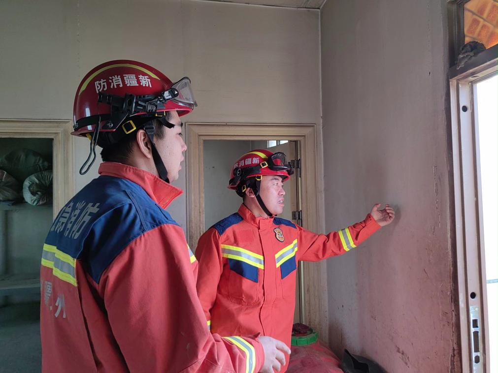 Firefighters examine a building at a village in Atux City of Kizilsu Kirgiz Autonomous Prefecture, northwest China's Xinjiang Uygur Autonomous Region, Dec. 19, 2023. No casualties have been reported so far after a 5.5-magnitude earthquake jolted the city of Atux in Kizilsu Kirgiz Autonomous Prefecture in northwest China's Xinjiang Uygur Autonomous Region. (Photo by Dong Zhigang/Xinhua)