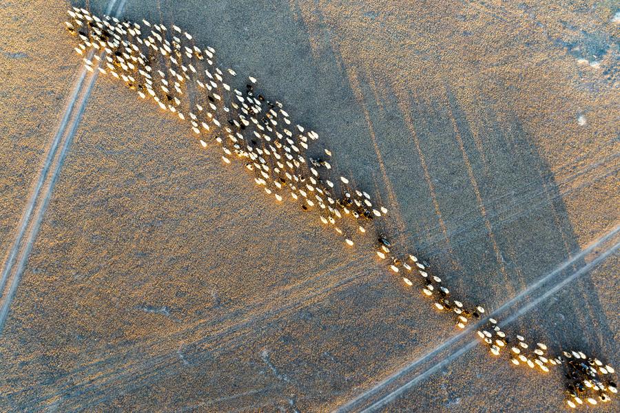 This aerial photo taken on Dec. 18, 2023 shows sheep heading back to shed in Ngoqu Town, Nyima County of Nagqu City, southwest China's Xizang Autonomous Region. (Xinhua/Jiang Fan)