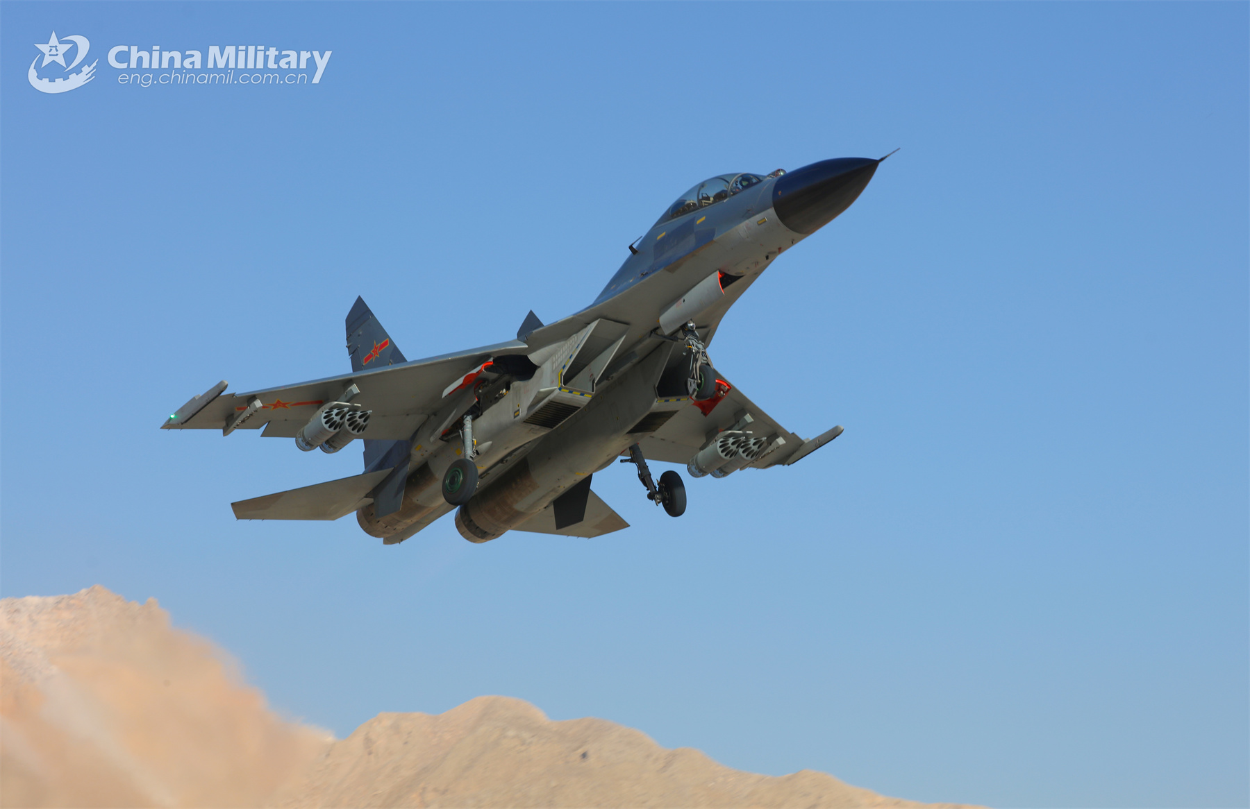 A fighter jet attached to an aviation brigade of the air force under the PLA Western Theater Command soars into the sky during a flight training exercise in early December, 2023. (eng.chinamil.com.cn/Photo by Yu Zeqi)