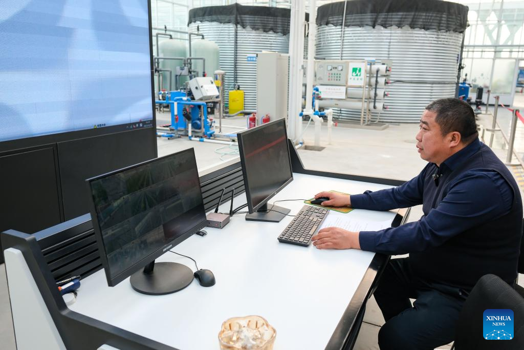 A staff member monitors automated operation at an agriculture science and technology exhibition hall in Changji, northwest China's Xinjiang Uygur Autonomous Region, Dec. 19, 2023. The exhibition hall, which was put into operation in 2022, uses Internet of Things and targeted irrigation technologies to realize highly automated planting of vegetables. Changji has advanced intelligent farming to raise the yield and quality of farm products in recent years. (Xinhua/Zhang Cheng)