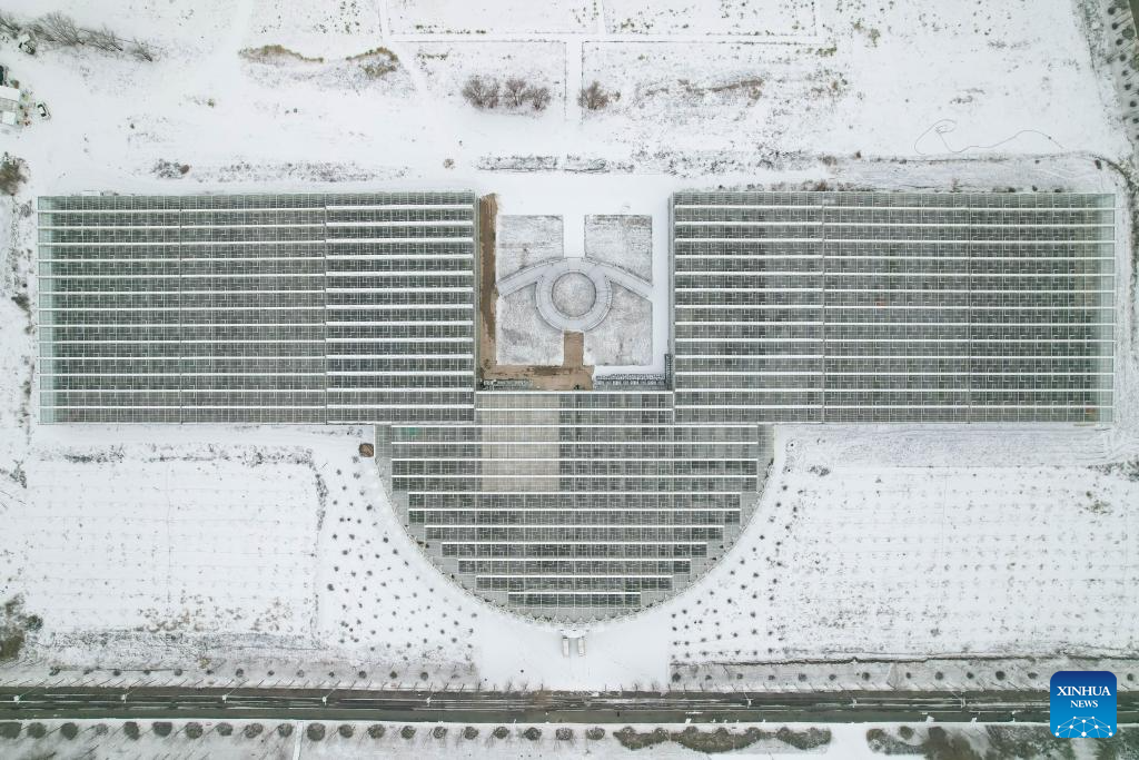This aerial photo taken on Dec. 19, 2023 shows an agriculture science and technology exhibition hall in Changji, northwest China's Xinjiang Uygur Autonomous Region. The exhibition hall, which was put into operation in 2022, uses Internet of Things and targeted irrigation technologies to realize highly automated planting of vegetables. Changji has advanced intelligent farming to raise the yield and quality of farm products in recent years. (Xinhua/Zhang Cheng)