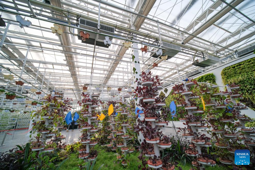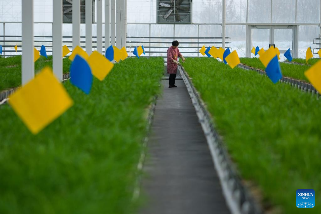 This photo shows the interior view of an agriculture science and technology exhibition hall in Changji, northwest China's Xinjiang Uygur Autonomous Region, Dec. 19, 2023. The exhibition hall, which was put into operation in 2022, uses Internet of Things and targeted irrigation technologies to realize highly automated planting of vegetables. Changji has advanced intelligent farming to raise the yield and quality of farm products in recent years. (Xinhua/Zhang Cheng)