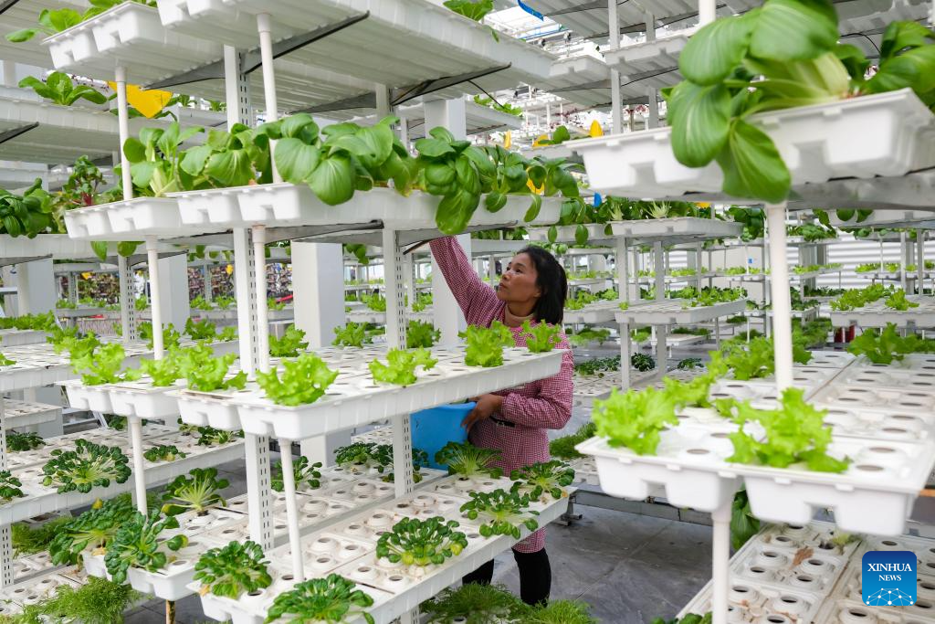 A staff member works at an agriculture science and technology exhibition hall in Changji, northwest China's Xinjiang Uygur Autonomous Region, Dec. 19, 2023. The exhibition hall, which was put into operation in 2022, uses Internet of Things and targeted irrigation technologies to realize highly automated planting of vegetables. Changji has advanced intelligent farming to raise the yield and quality of farm products in recent years. (Xinhua/Zhang Cheng)