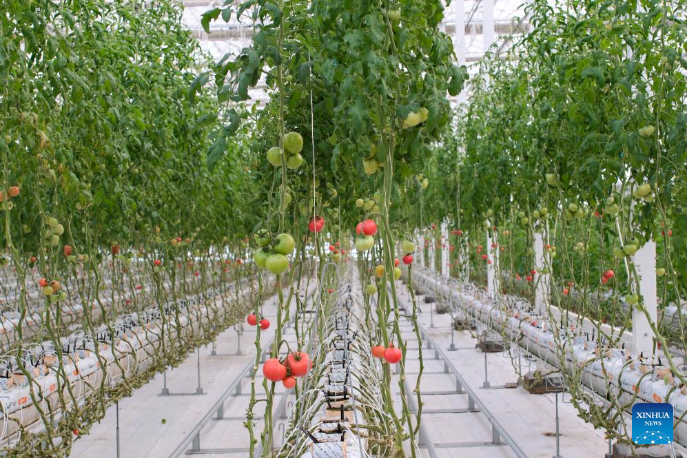Tomatoes are seen at an agriculture science and technology exhibition hall in Changji, northwest China's Xinjiang Uygur Autonomous Region, Dec. 19, 2023. The exhibition hall, which was put into operation in 2022, uses Internet of Things and targeted irrigation technologies to realize highly automated planting of vegetables. Changji has advanced intelligent farming to raise the yield and quality of farm products in recent years. (Xinhua/Zhang Cheng)