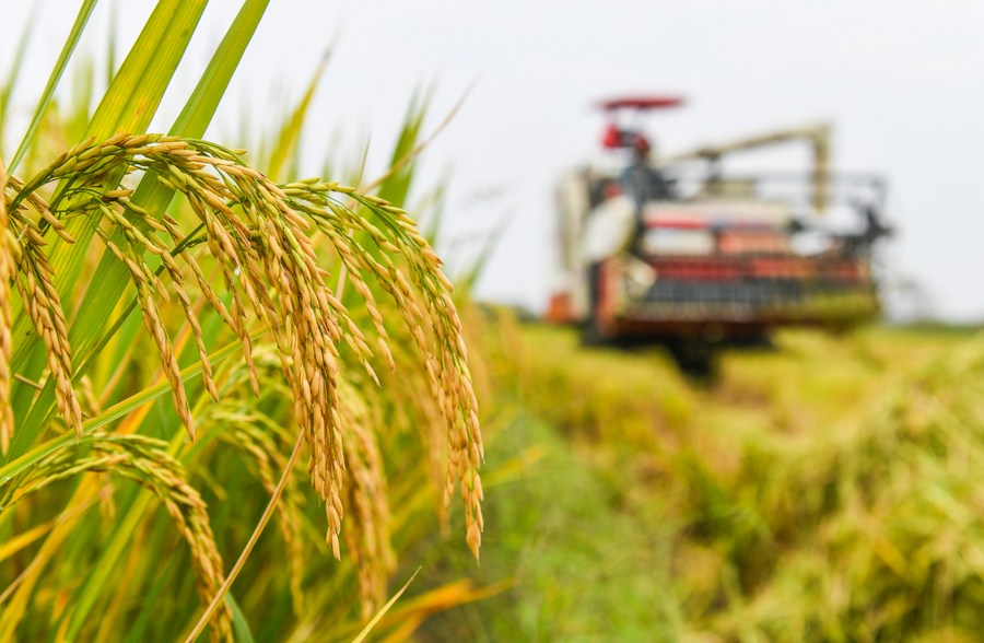 Rice is harvested in Daoxian County, central China's Hunan Province, Oct. 14, 2023. (Photo by Jiang Keqing/Xinhua)