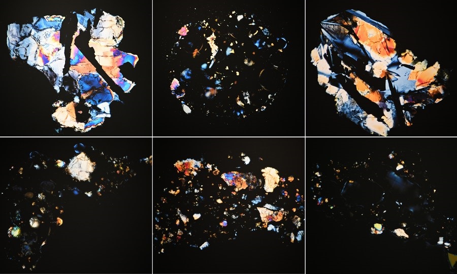 This combo photo shows cross-polarized micrographs of different lunar soil particles displayed at an exhibition themed on lunar soil research achievements in University of Science and Technology of China, in Hefei, East China's Anhui province on April 19, 2023. [Photo/Xinhua]