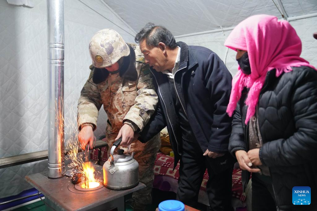 A soldier lights the fire in a stove for quake-affected people in Liugou Township, Jishishan County, northwest China's Gansu Province, Dec. 19, 2023. The Chinese People's Liberation Army (PLA) and the People's Armed Police Force (PAPF) have deployed multiple rescue forces to quake-hit areas in response to a 6.2-magnitude earthquake that jolted northwest China's Gansu Province late Monday. (Xinhua/Zhang Yongjin)