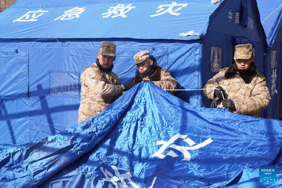 Soldiers set up tents for quake-affected people in Shiyuan Township, Jishishan County, northwest China's Gansu Province, Dec. 21, 2023. The Chinese People's Liberation Army (PLA) and the People's Armed Police Force (PAPF) have deployed multiple rescue forces to quake-hit areas in response to a 6.2-magnitude earthquake that jolted northwest China's Gansu Province late Monday. (Xinhua/Zhang Yongjin)