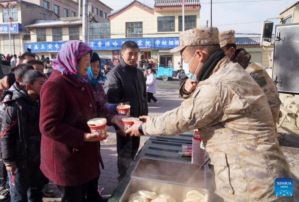 Soldiers provide hot food for quake-affected people in Liuji Township, Jishishan County, northwest China's Gansu Province, Dec. 21, 2023. The Chinese People's Liberation Army (PLA) and the People's Armed Police Force (PAPF) have deployed multiple rescue forces to quake-hit areas in response to a 6.2-magnitude earthquake that jolted northwest China's Gansu Province late Monday. (Xinhua/Zhang Yongjin)
