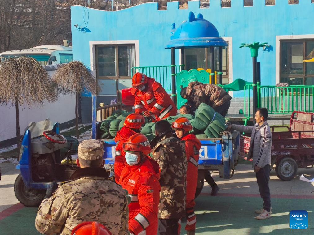 Members of the Chinese People's Armed Police Force help to distribute bedclothes to quake-affected people in Liuji Township, Jishishan County, northwest China's Gansu Province, Dec. 21, 2023. The Chinese People's Liberation Army (PLA) and the People's Armed Police Force (PAPF) have deployed multiple rescue forces to quake-hit areas in response to a 6.2-magnitude earthquake that jolted northwest China's Gansu Province late Monday. (Photo by Cui Yunlong/Xinhua)