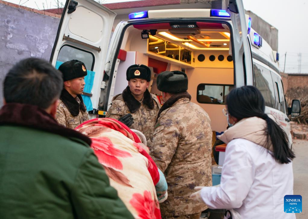 Soldiers provide medical service for quake-affected people in Shiyuan Township, Jishishan County, northwest China's Gansu Province, Dec. 21, 2023. The Chinese People's Liberation Army (PLA) and the People's Armed Police Force (PAPF) have deployed multiple rescue forces to quake-hit areas in response to a 6.2-magnitude earthquake that jolted northwest China's Gansu Province late Monday. (Xinhua/Zhang Yongjin)