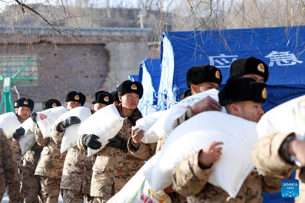 Members of the Chinese People's Armed Police Force help to carry bags of flour for quake-affected people in Liuji Township, Jishishan County, northwest China's Gansu Province, Dec. 21, 2023. The Chinese People's Liberation Army (PLA) and the People's Armed Police Force (PAPF) have deployed multiple rescue forces to quake-hit areas in response to a 6.2-magnitude earthquake that jolted northwest China's Gansu Province late Monday. (Photo by Hou Chonghui/Xinhua)