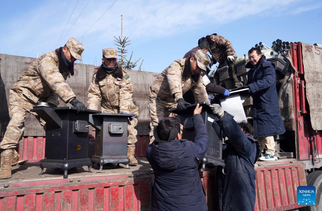 Soldiers unload stoves for quake-affected people in Shiyuan Township, Jishishan County, northwest China's Gansu Province, Dec. 21, 2023. The Chinese People's Liberation Army (PLA) and the People's Armed Police Force (PAPF) have deployed multiple rescue forces to quake-hit areas in response to a 6.2-magnitude earthquake that jolted northwest China's Gansu Province late Monday. (Xinhua/Zhang Yongjin)