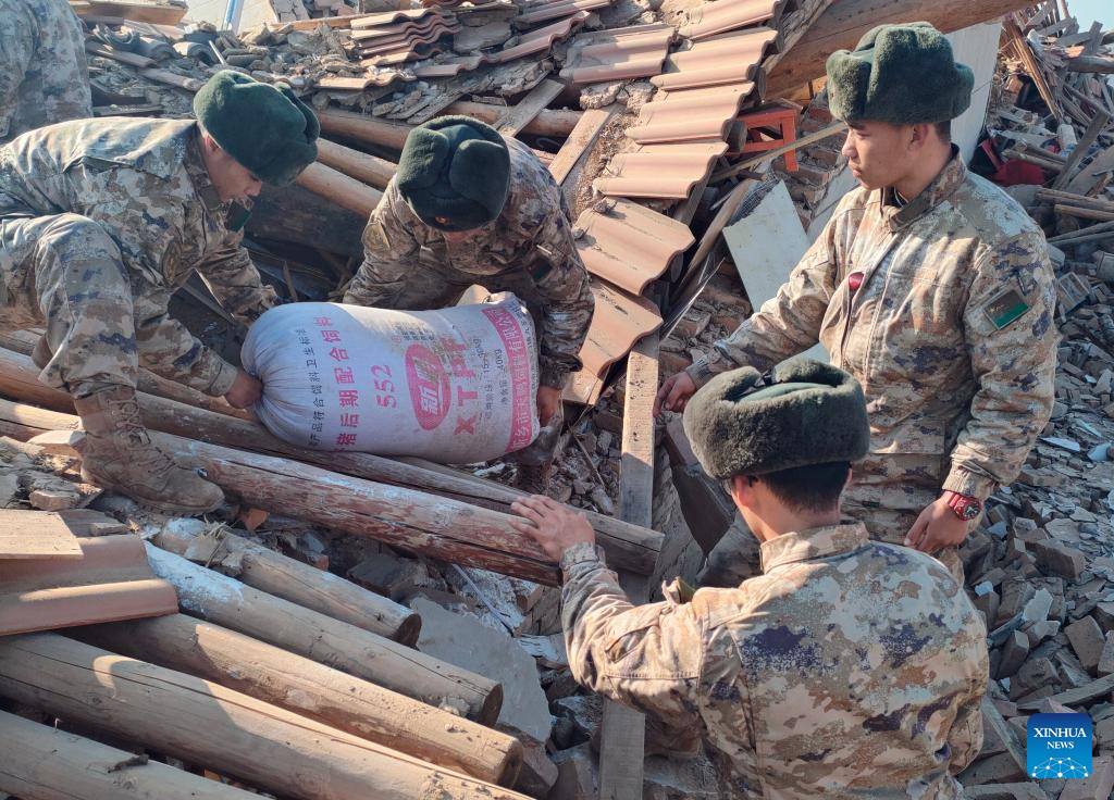 Soldiers help to clear materials for quake-affected people in Shiyuan Township, Jishishan County, northwest China's Gansu Province, Dec. 21, 2023. The Chinese People's Liberation Army (PLA) and the People's Armed Police Force (PAPF) have deployed multiple rescue forces to quake-hit areas in response to a 6.2-magnitude earthquake that jolted northwest China's Gansu Province late Monday. (Photo by Bai Jiacheng/Xinhua)