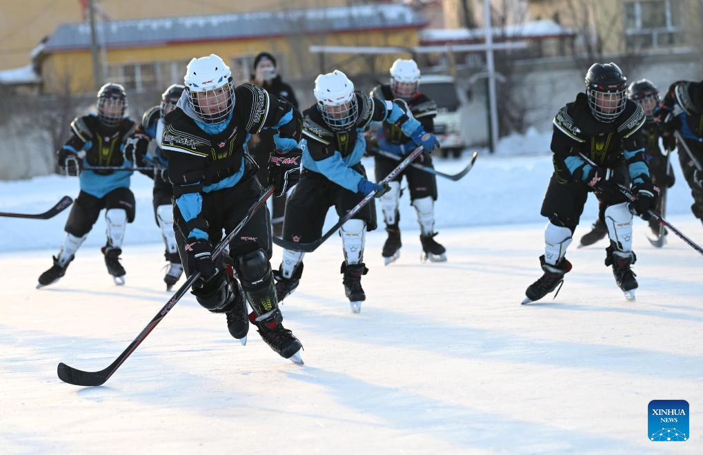 Students of ice hockey team participate in training at the Shuixigou middle school in Urumqi County, northwest China's Xinjiang Uygur Autonomous Region, Dec. 20, 2023. (Xinhua/Li He)