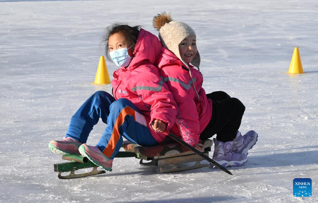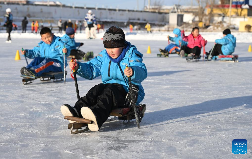 Students experience ice-sleigh at the Shuixigou middle school in Urumqi County, northwest China's Xinjiang Uygur Autonomous Region, Dec. 20, 2023. (Xinhua/Li He)