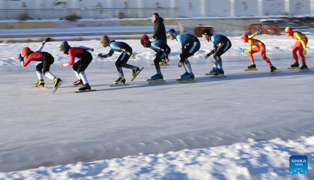 Students of speed skating team participate in training at the Shuixigou middle school in Urumqi County, northwest China's Xinjiang Uygur Autonomous Region, Dec. 20, 2023. (Xinhua/Li He)