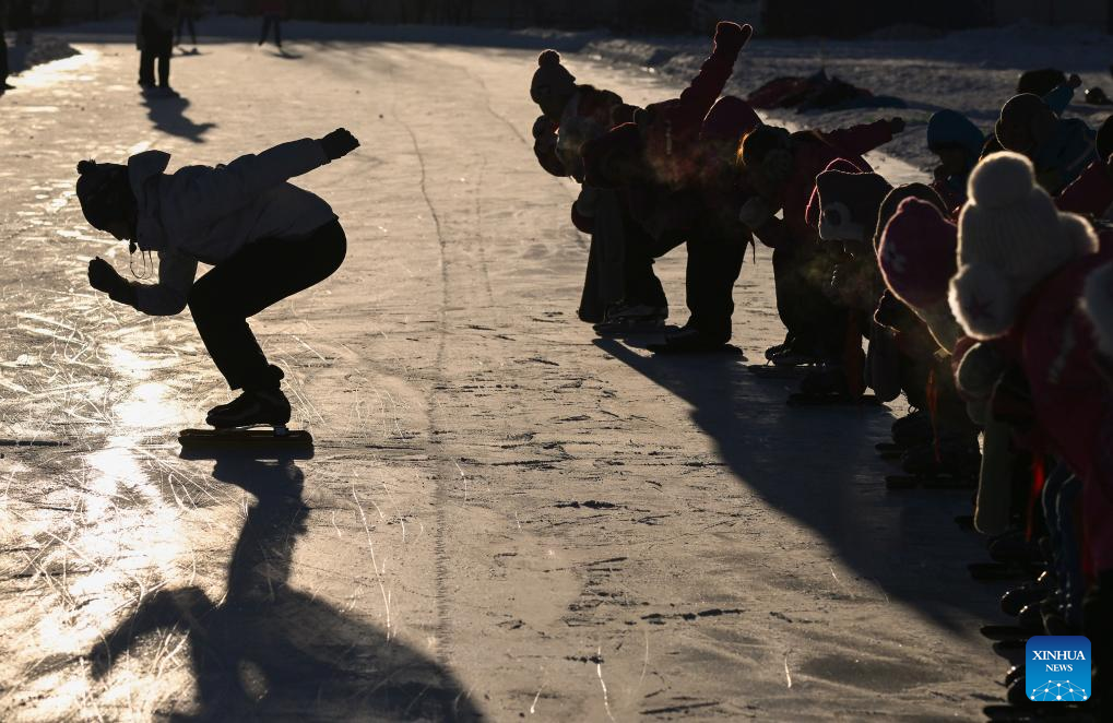 Students take a speed skating course at the Shuixigou middle school in Urumqi County, northwest China's Xinjiang Uygur Autonomous Region, Dec. 20, 2023. (Xinhua/Li He)