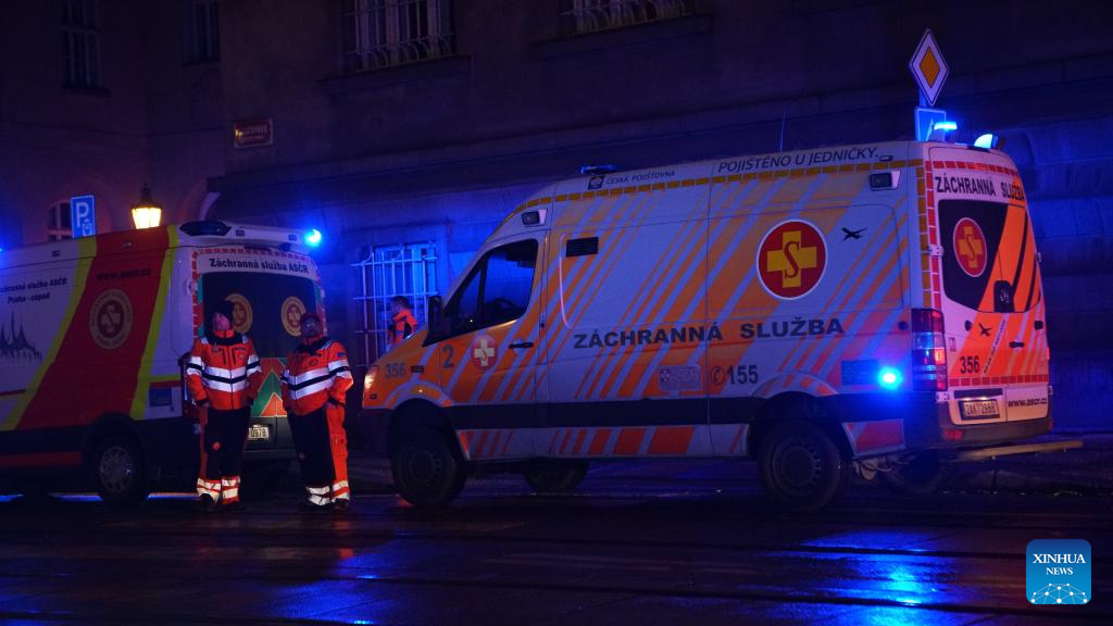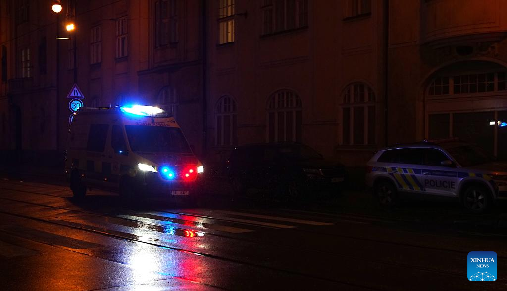 Emergency vehicles are seen near the site of a shooting in Prague, the Czech Republic, on Dec. 21, 2023. At least 15 people were killed in a shooting at a school in the Czech capital Prague on Thursday, local police said. (Photo by DanaKesnerova/Xinhua)