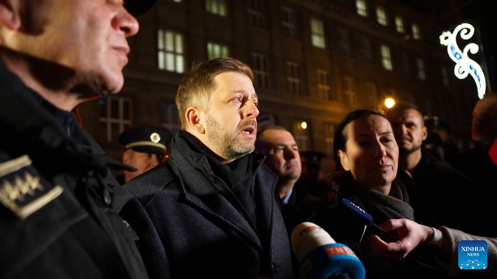 Czech Interior Minister Vit Rakusan (C) speaks at a press briefing about the shooting in Prague, the Czech Republic, on Dec. 21, 2023. At least 15 people were killed in a shooting at a school in the Czech capital Prague on Thursday, local police said. (Photo by DanaKesnerova/Xinhua)