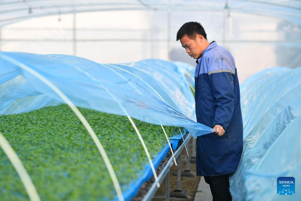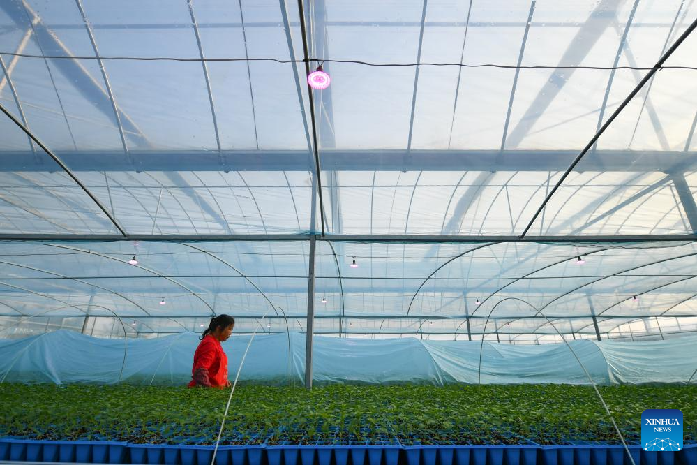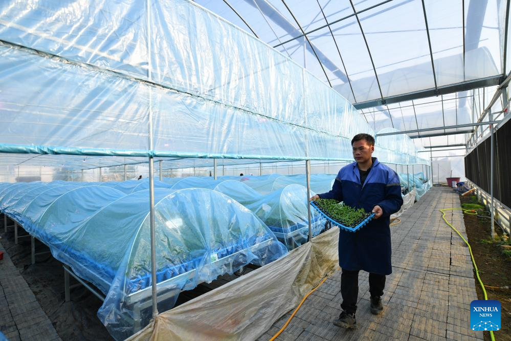 A villager transfers vegetable seedlings at a greenhouse base for vegetable plantation in Jinggang Town of Wangcheng District, Changsha, central China's Hunan Province, Dec. 21, 2023.?(Xinhua/Chen Zeguo)